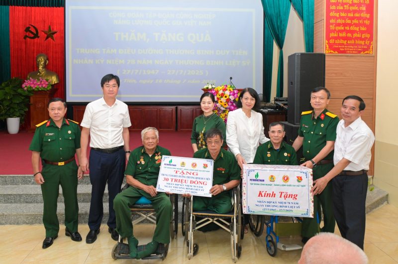 Nhân dịp kỷ niệm 78 năm Ngày Thương binh – Liệt sĩ (27/7/1947 – 27/7/2025), Công đoàn và Hội Cựu chiến binh Tập đoàn Công nghiệp – Năng lượng Quốc gia Việt Nam (Petrovietnam) đã đến thăm và tặng quà các thương, bệnh binh hiện đang được điều trị tại Trung tâm điều dưỡng thương binh Duy Tiên, tỉnh Ninh Bình.