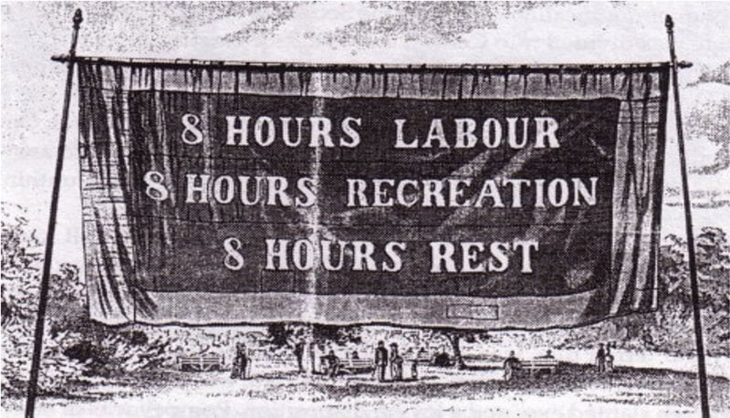 Khẩu hiệu “8 giờ làm việc, 8 giờ giải trí, 8 giờ nghỉ ngơi” xuất hiện nhiều tại các thành phố ở Mỹ ngày 01/5/1886