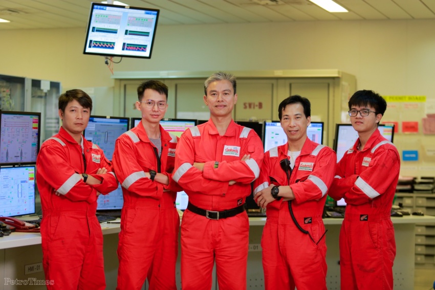 | Giàn trưởng Phạm Vũ Thắng (giữa) và cán bộ kỹ sư trên giàn Sư Tử Vàng CPP. |