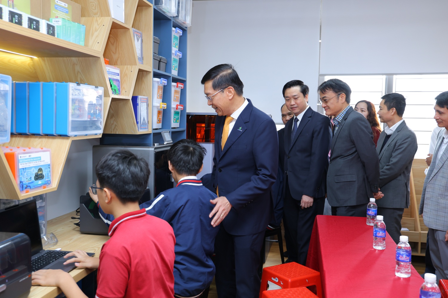 Lãnh đạo Sở Giáo dục và Đào tạo tỉnh Thanh Hóa, Petrovietnam và PTSC tham quan, động viên học sinh tại Phòng STEM Trường THCS Trần Mai Ninh |