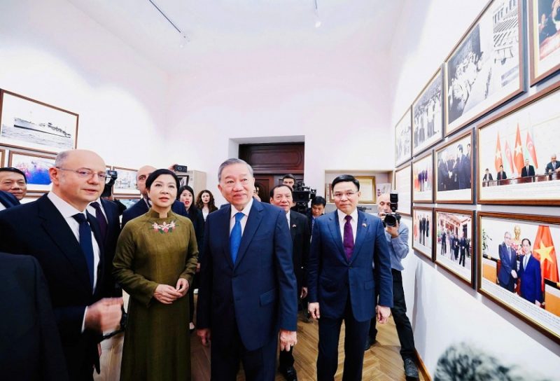 | Tổng Bí thư Tô Lâm và Phu nhân cùng Chủ tịch Petrovietnam Lê Mạnh Hùng và các đại biểu tham quan Phòng lưu niệm. |