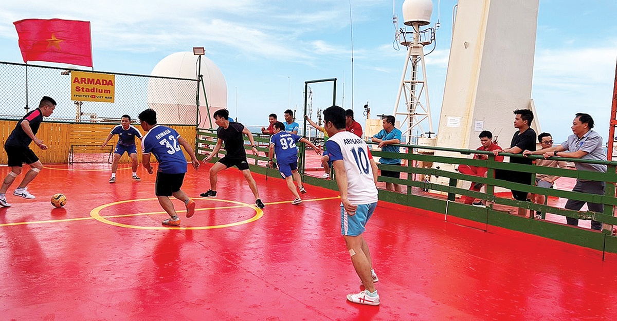 Ở các giàn đầu giếng H1, H4, H5, không gian hạn chế hơn nhưng Tết vẫn “đầy đặn” nhờ sự quan tâm của lãnh đạo. Anh em có nhà ăn với tiện ích cơ bản, cùng chuẩn bị mâm cơm tất niên chiều 30. Đặc biệt, nghi thức cúng đầu giếng với mâm ngũ quả là hoạt động không thể thiếu để gửi gắm ước mong vận hành an toàn, không sự cố, sản lượng đạt chỉ tiêu. Không gian chật thì… sáng tạo, anh em thu vén, sắp xếp lại nhà kho để làm chỗ thi karaoke, đánh cờ, thậm chí tổ chức được cả giải pickleball.